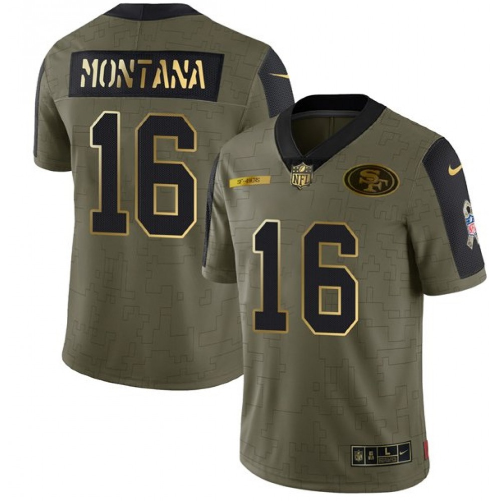 Men's San Francisco 49ers #16 Joe Montana 2021 Olive Camo Salute To Service Limited Stitched Jersey